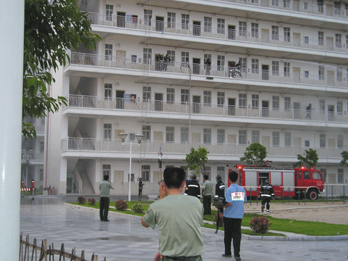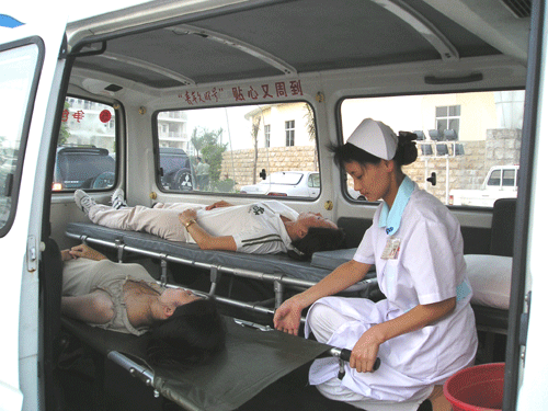 7月22日下午,漳州市119消防支队在漳州一中分校进行消防演练,省级青年文明号急诊科作为“110社会服务联动单位”,也应邀参加了为烧伤病员施行现场急救的演练。下列图为救火演练及抢救伤员的场面。(简小兰报导)