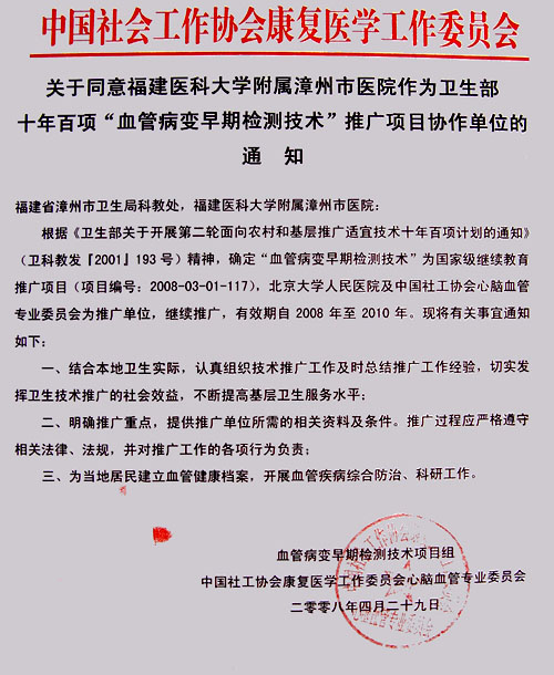 关于同意拉斯维加斯3499网站登录作为卫生部十年百项“血管病变早期检测技术”推广
